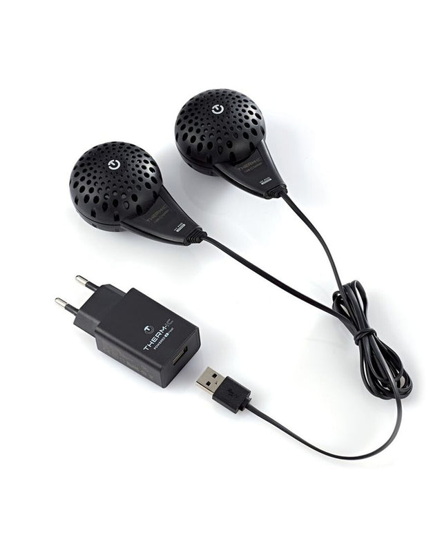 Thermic UV Pod Dryer är den minsta skotorken i Thermics sortiment som med sin praktiska och kompakta design tar minimal plats i din packning – med andra ord perfekt att ta med på alla dina äventyr! De smidiga hörlursliknande tork-poddarna är utrustade med ventilation och UV-lampor som snabbt och skonsamt torkar alla dina olika typer av skor eller handskar efter långa dagar ute i naturen. Använd denna tystgående, smidiga och effektiva torken för att få torra, uppvärmda och fräscha skor eller handskar på bara några timmar så att du snabbt kan bege dig ut på nästa äventyr. Den smidiga USB kabeln gör att de smidigt kan anslutas till olika enheter (väggplugg ingår ej) Specifikationer: Kompakt, tack vare sin lilla, runda form tar den minimalt med plats i din packing. Torkar alla typer och storlekar av skor, pjäxor, kängor och stövlar Tystgående Kompakt design för enkel förvaring